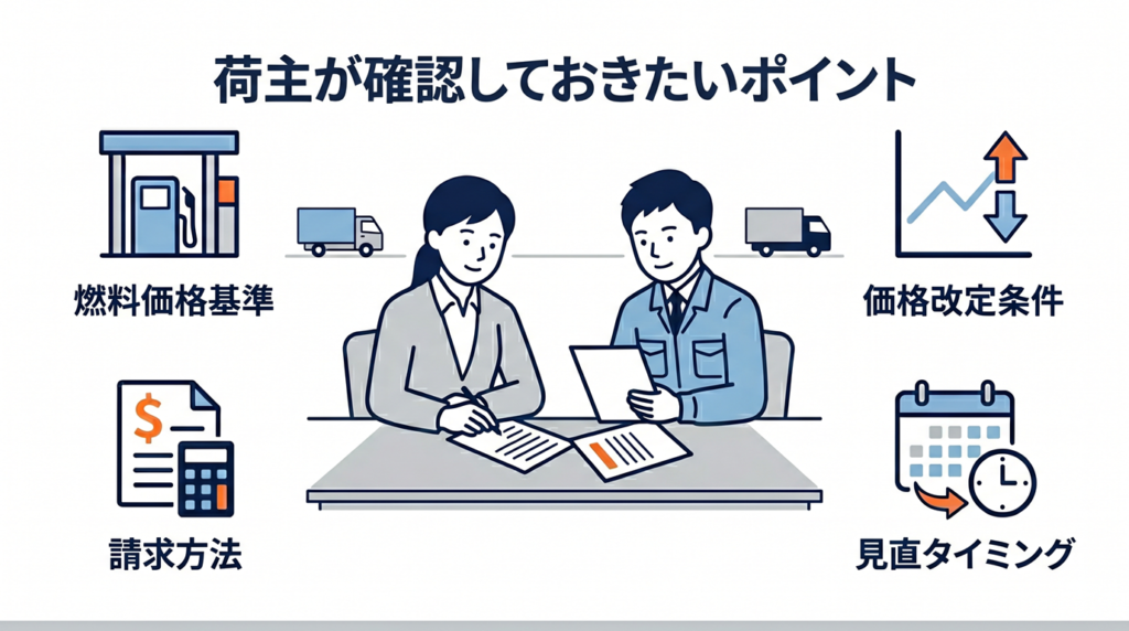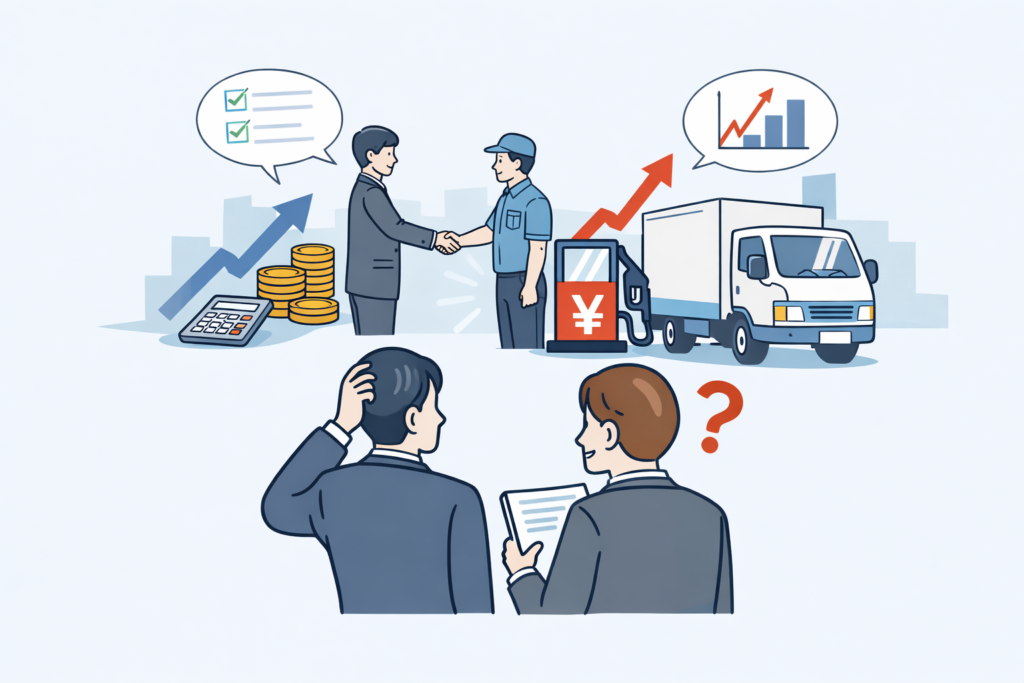 荷主にとっても、基準や見直し条件が明確であれば、なぜ今回の請求額になったのかを確認しやすくなります。運送会社にとっても、燃料価格が急に変動した際の調整方法をあらかじめ決めておけるという意味では、合理的な仕組みです。